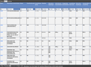 Tabel A, met zo'n 3000 unieke stoffen, is volledig doorzoekbaar op elk van de 20 kolommen.